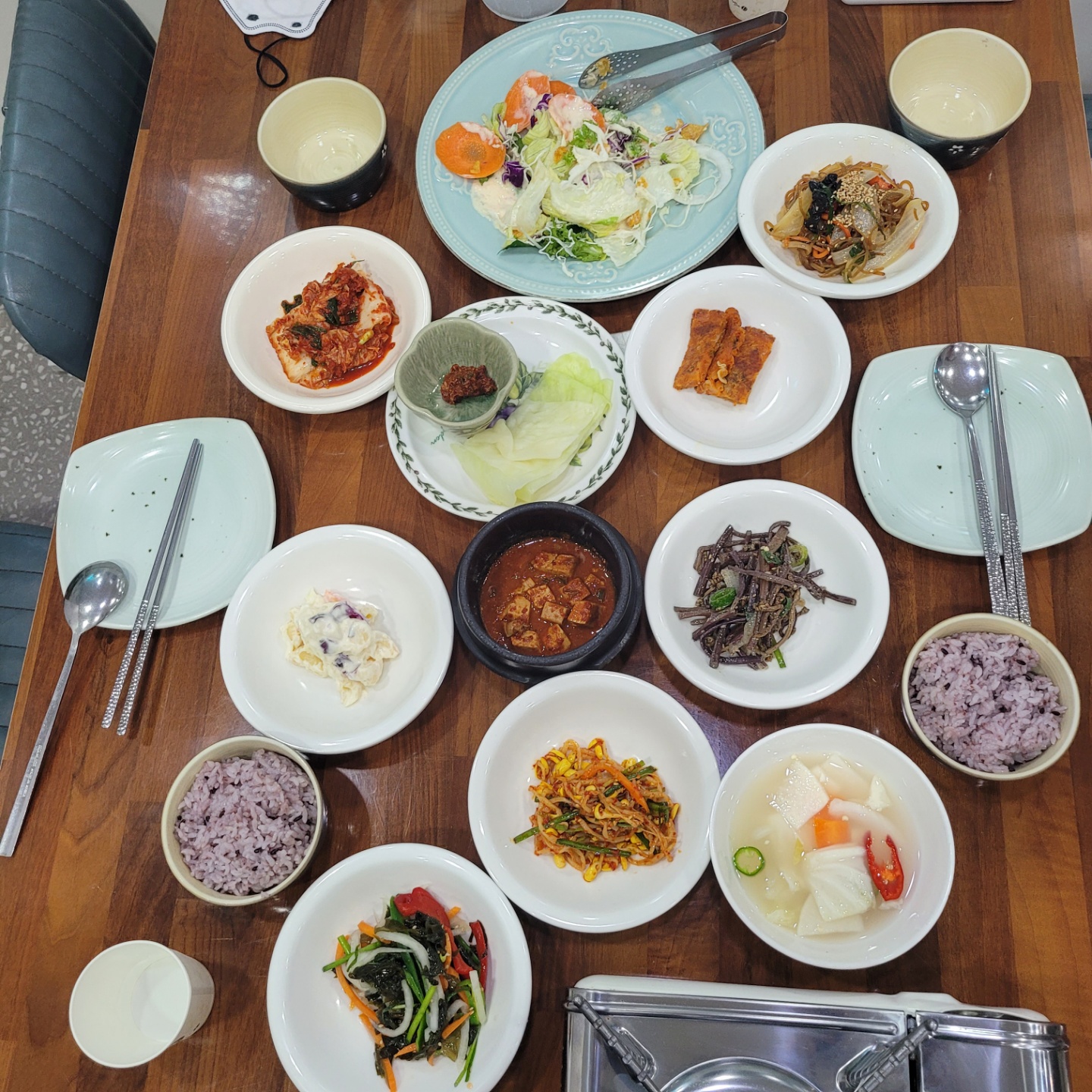 | 고사리무침 + 콩나물무침 + 오이미역무침 + 동치미 + 콘사라다 + 김치 + 빈대떡 + 잡채 + 두부짜끌이 + 쌈(된장) |